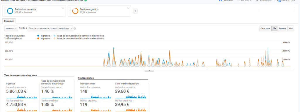Cuando un cliente desconoce o no tiene claro la efectividad de una estrategia SEO, debemos darle datos y ejemplos como este. En nuestro cliente de productos para barcos, podemos comprobar como el 85% de las ventas que tiene la web, son de usuarios que llegan a la web gracias una búsqueda orgánica y el posicionamiento de la web ganado con la estrategia.