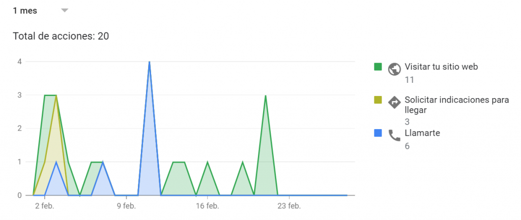 A su vez, vemos que de las 592 veces que ha aparecido su ficha de empresa en Google, ha tenido un total de 20 leads en tan solo un mes. Como podemos ver a continuación, 11 de ellos han visitado la web (que esta optimizada para que cuando entre el usuario pueda dejar o su teléfono o rellenar un formulario de contacto), 3 de los leads han solicitado indicaciones para llegar a su centro y por último 6 han llamado directamente para solicitar información o pedir cita.